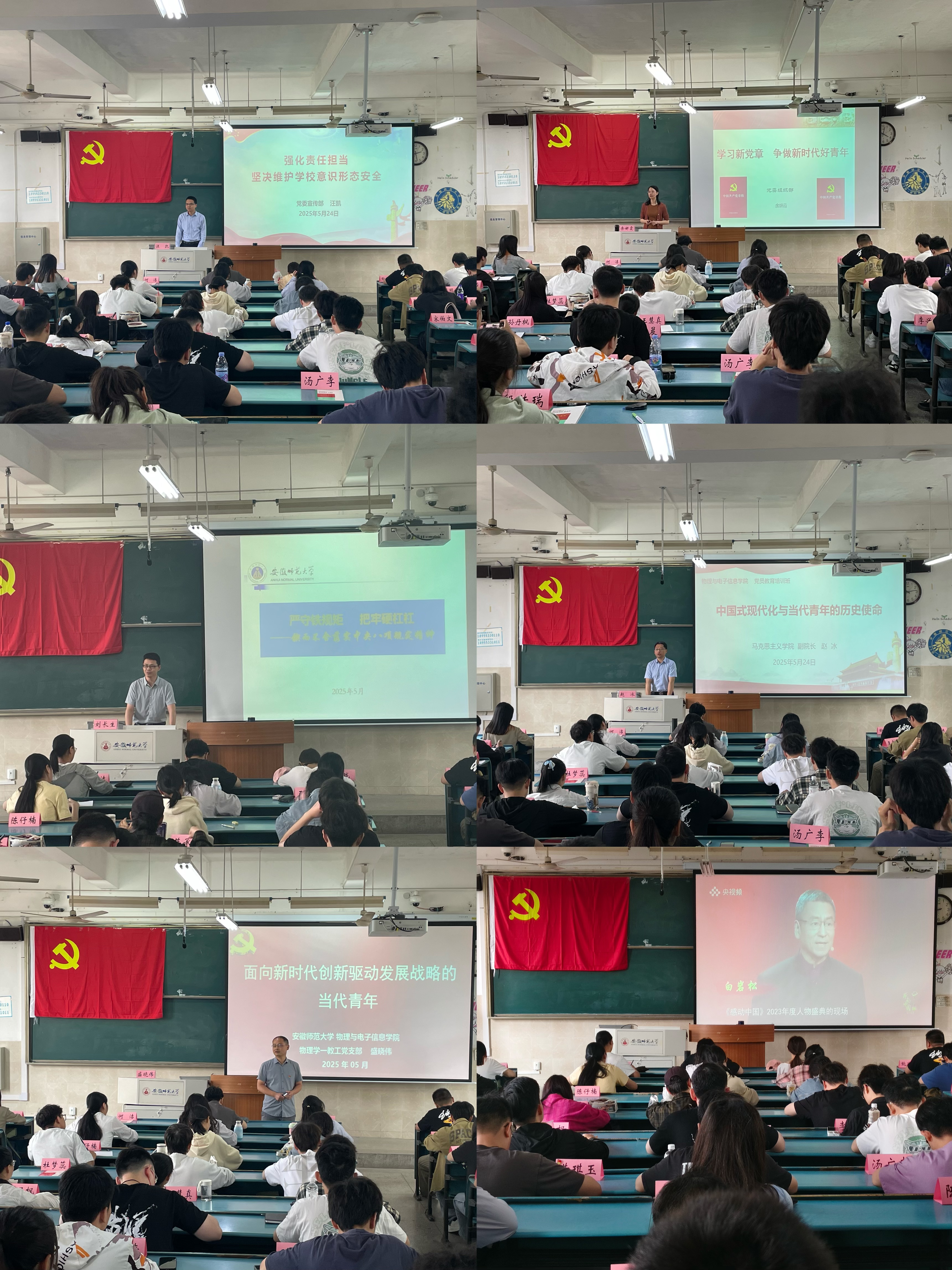 本次培训采取理论辅导、视频教学、专题研讨、实践活动和个人自学相结合的方式开展,先后邀请了党委宣传部常务副部长汪凯,党校常务副校长、组织部副部长余妍霞,纪委办公室案管审理室主任刘长生、马克思主义学院副院长赵冰,bet36365路检测中心副院长盛晓伟等领导老师分别围绕《强化责任担当,坚决维护学校意识形态安全》《学习新党章,争做优秀党员》《严守铁规矩,把牢硬杠杠——锲而不舍落实中央八项规定精神》《中国式现代化与当代青年的历史使命》《面向新时代创新驱动发展战略的当代青年》为学员授课。视频教学环节,学员们共同观看了《感动中国》《榜样9》等学习教育纪录片。专题研讨环节,学员们围绕深入贯彻中央八项规定精神学习教育等开展热烈的专题研讨。实践活动环节,开展理响物电微宣讲、朋辈交流会和校园内自行车摆放等,引导学生在参加实践、服务同学中强化宗旨意识。