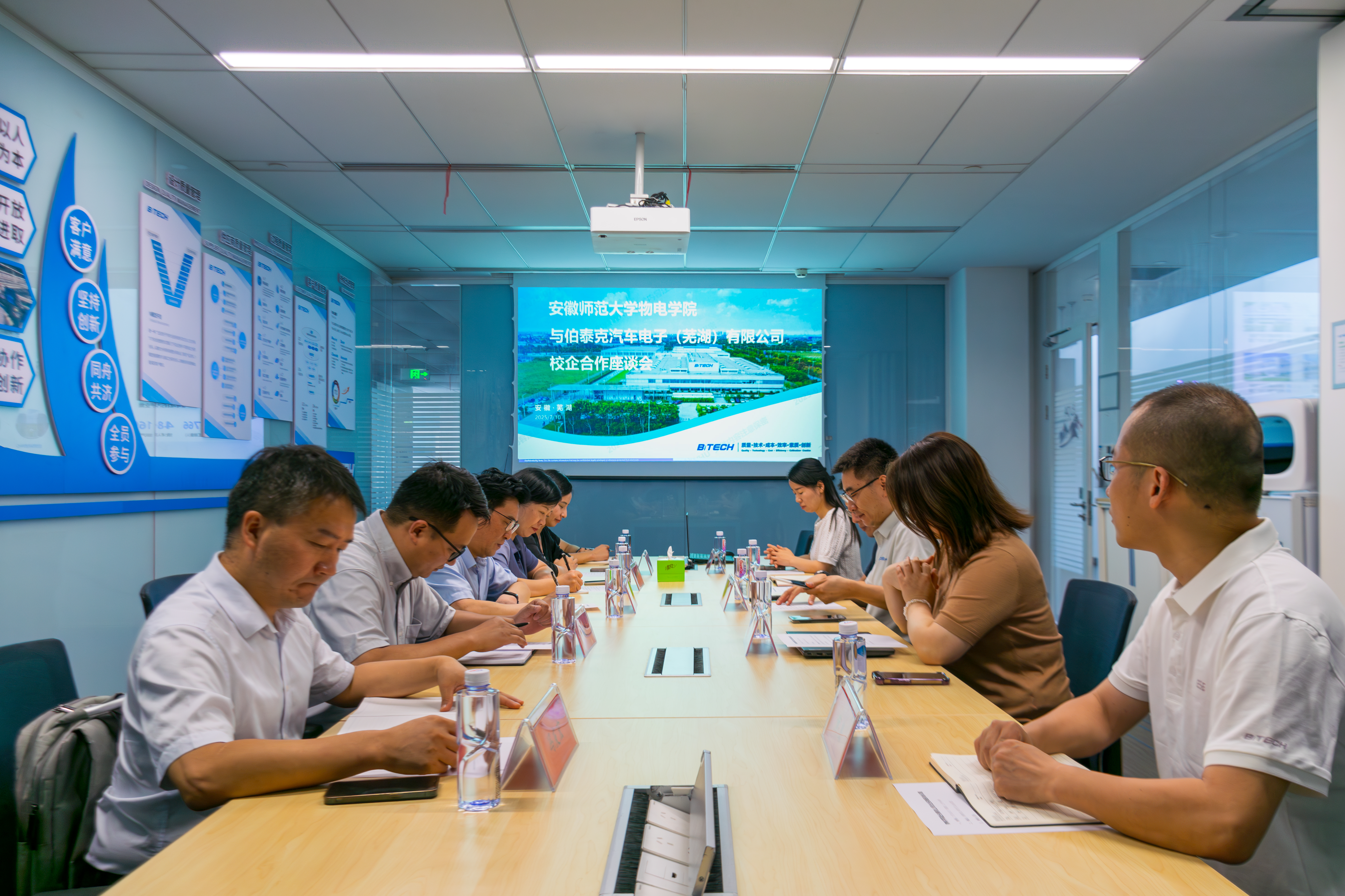 高峰向两家公司在就业实习等工作上给予师大的青睐与支持表示感谢。他强调,作为一所综合性大学,作为芜湖市的“城市合伙人”,安徽师范大学始终将服务地方经济社会发展作为重要使命,坚持“问计于企、问需于企”。他指出,埃泰克和伯泰克作为行业内的龙头企业,在技术创新和产业升级方面具有丰硕成果,而师大在高层次人才引进、学科建设、人才培养等方面有一定积累,希望校企双方能够建立起更加紧密的协作机制,尤其是在先进产品技术领域开展多学科交叉合作,从而更好地发挥校企共享共创的优势,以期共同打造产教深度融合、校企紧密合作的发展新模式,更好地服务国家战略和区域经济社会发展。