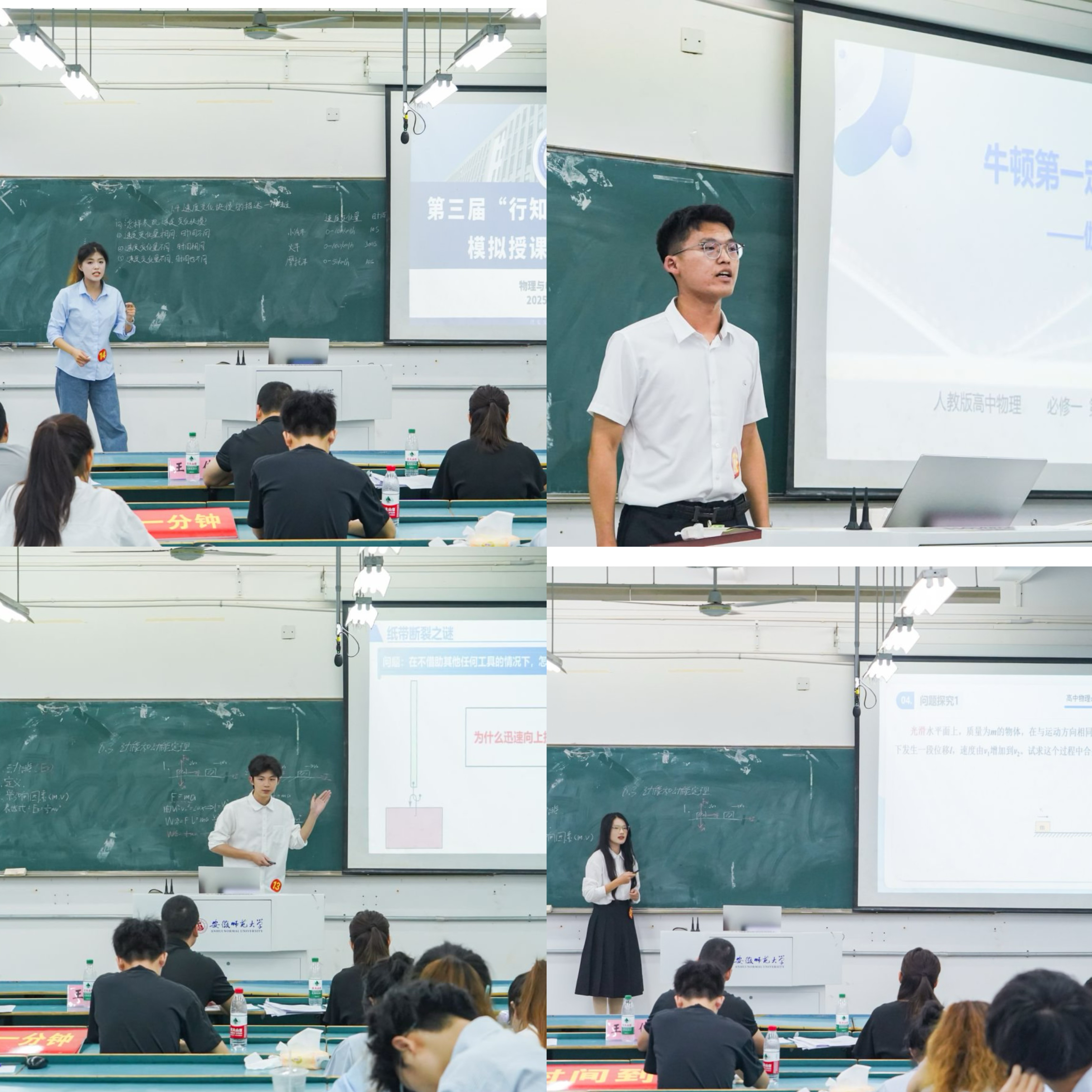 在模拟授课环节参赛选手选择高中牛顿第一定律、自由落体、滑动摩擦力、加速度、牛顿第三定律等课题,进行了精彩的模拟课堂教学。精美的课件、工整的板书、大方自然的教态、有趣的演示实验,充分展现出选手们扎实的教学基本功和逻辑严谨的物理教学思维。其中邓波涛同学通过自制教具的演示展开教学,陈晓艺同学结合AI技术利用数字人导入教学,为大家呈现出一堂有趣的物理课。