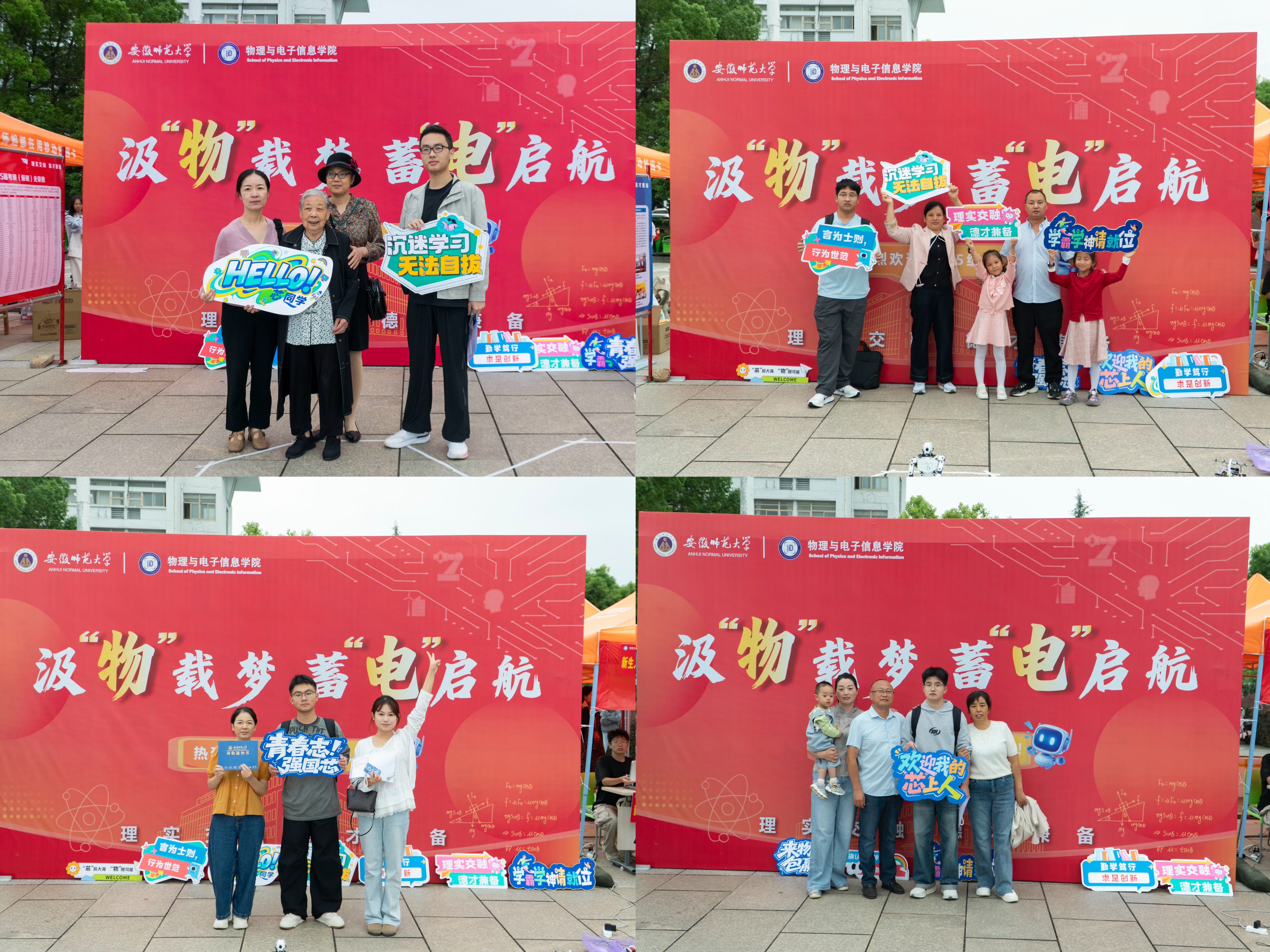 报到现场,学院设置“迎新生”学术科技作品展,集中呈现物电学子的创新成果。从仿人机器人、智能汽车、5G远程驾驶车、四旋翼无人机,到物理师范生自制的法拉第磁生电实验装置、受迫振动与共振演示仪等教具,门类丰富、创意十足。学生志愿者现场进行操作演示和专业讲解,帮助新生直观感受学科魅力,增强专业认同。现场还通过学院学团组织介绍、育人品牌项目展示、2025届考研光荣榜、学科竞赛光荣榜等宣传展板,进一步强化学风建设和专业思想教育。