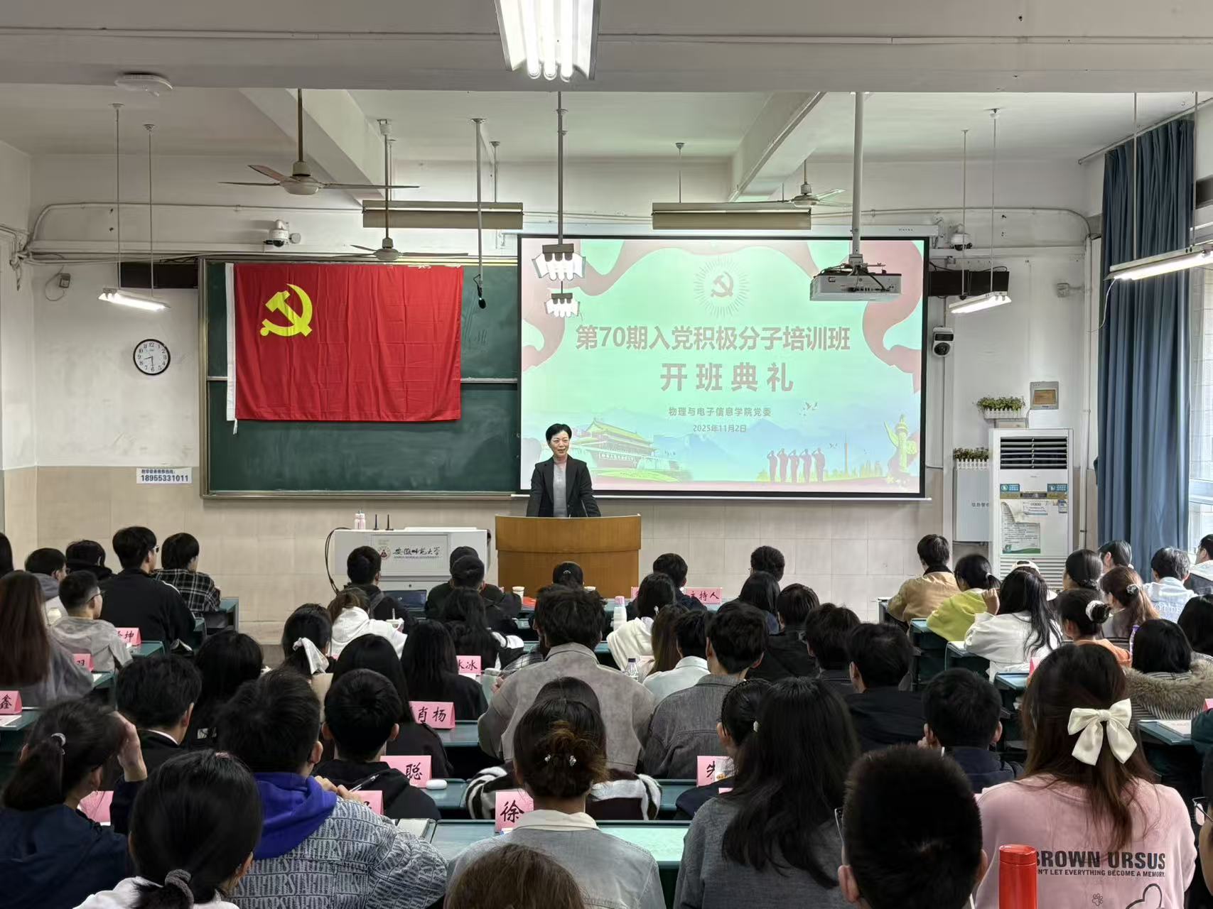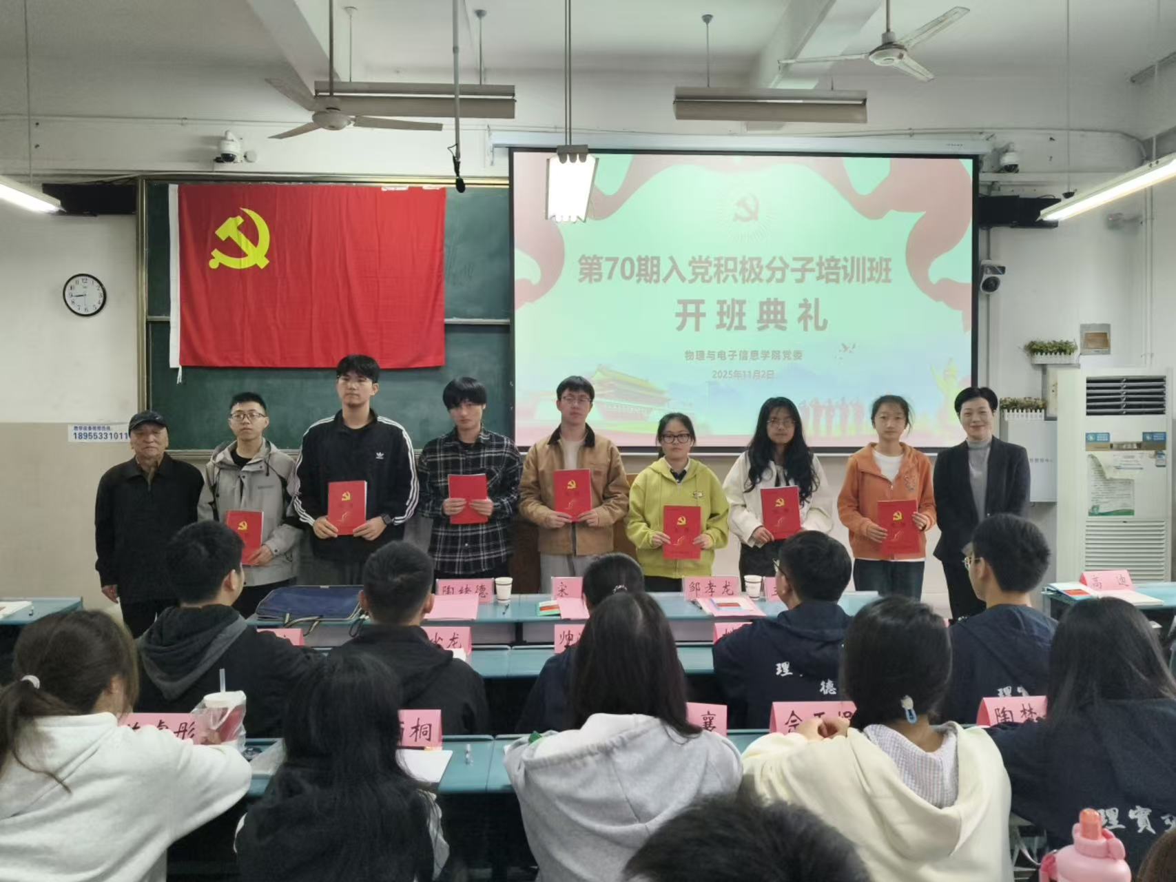 典礼上,邹孝龙介绍了本次培训班的基本情况,解读了班级管理的各项规章制度。2023级物理学(师范)专业本科生苏成同学作为学员代表进行表态发言。宋静和陶绪德为培训班学员代表发放了学院《先锋》学习手册。宋静要求,全体参训学员要充分认识培训意义,自觉端正学习态度;要严格遵守规章制度,自觉服从党校管理;要深入理解知行合一,自觉践行党员标准,充分发挥积极分子模范带头作用,做党的路线方针政策的宣传者、文明行为习惯养成的践行者、勇攀科学高峰的探索者、朋辈友爱帮扶的护航者和服务国家需要的争先者。