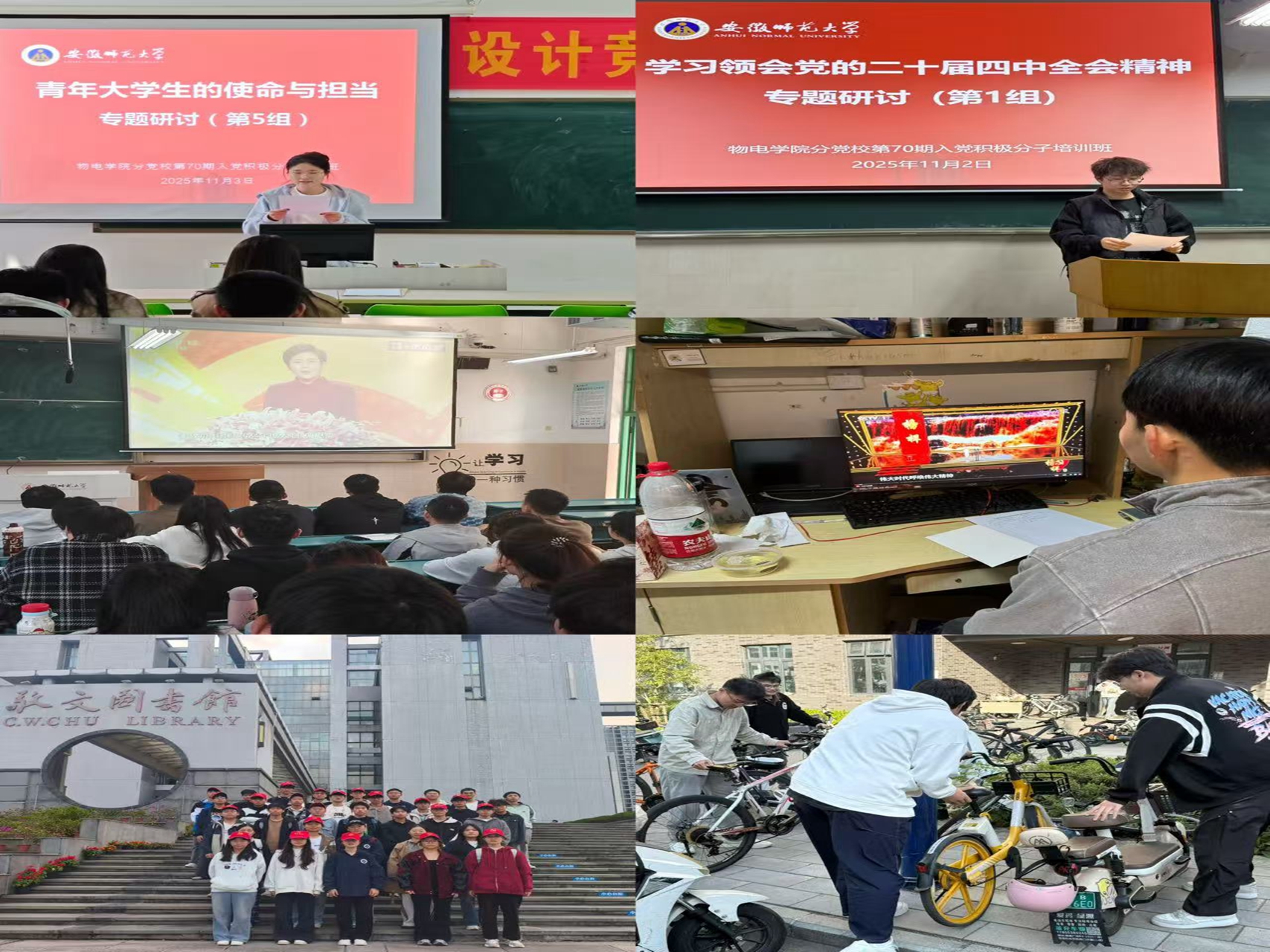 分组研讨环节,学员们围绕学习贯彻党的二十届四中全会精神、青年大学生的使命与担当等开展专题研讨。视频教学环节,学员们观看了《榜样》《感动中国》等教育纪录片。实践教学环节,学员们通过校内自行车摆放、社区科普宣讲等诠释青年担当。