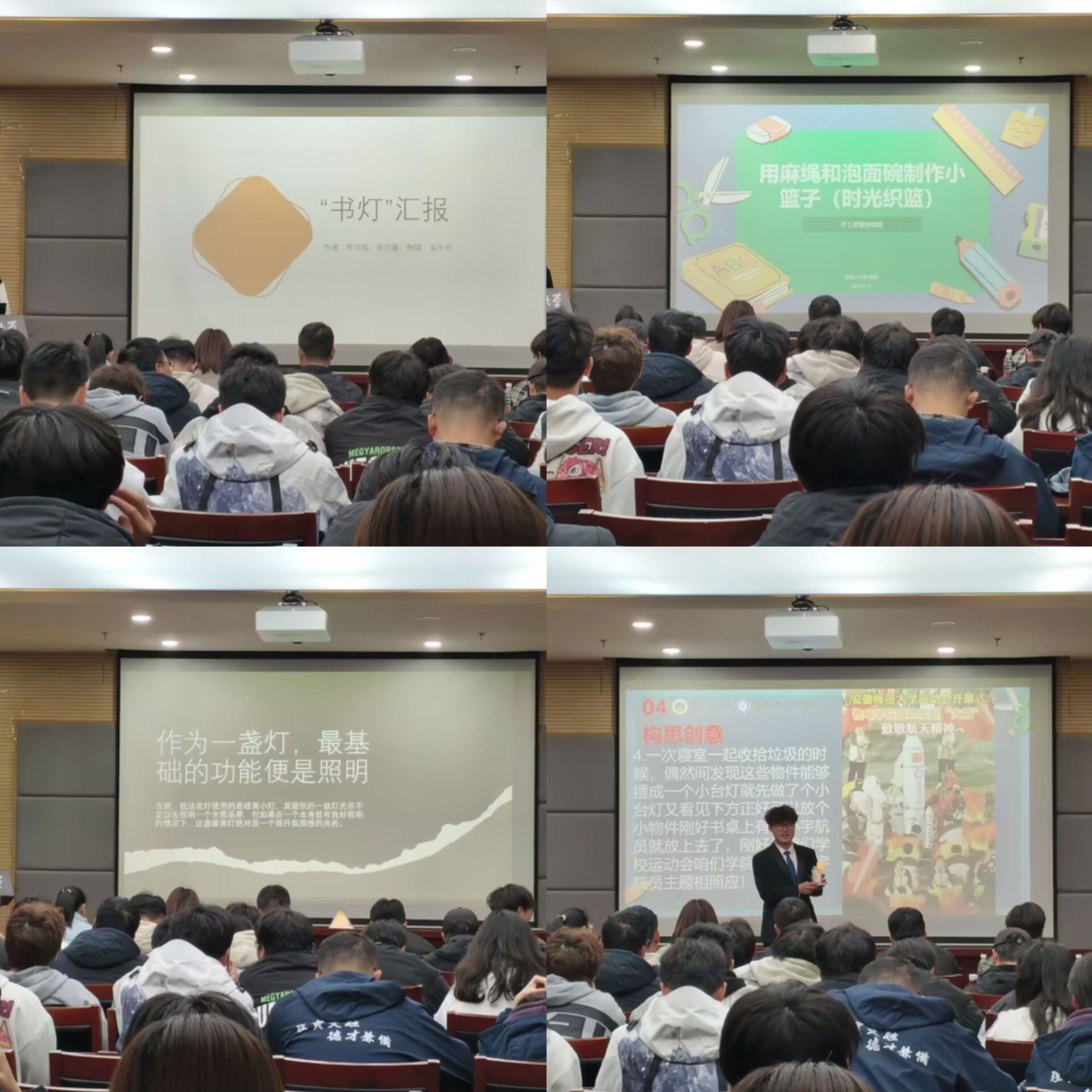 汇报中,赵昕源组用塑料瓶裁剪、高温弯曲定型、热熔固定、从而呈现出莲花的造型;肖宏亮组的花灯由三角板、草稿纸、小灯、胶水、麻绳组成,寄托了童年的怀念;吕静怡组以“环保再生”为核心理念,利用日常生活中常见的废弃材料一次性筷子、塑料瓶盖、废纸板等,通过创意设计与结构优化,打造一座可动态运转的微型摩天轮装置;安虹畅组利用从废弃的玩具车上拆下的电路板、小马达、废弃的木板,加上从电动自拍杆上拆下来的电池盒制作了自制遥控小车。