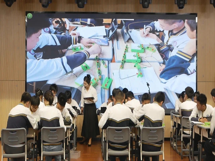 活动中,安师大附外城东校区孙婷婷老师以沪科版九年级物理《测量电功率》复习实验课作为展示课例,采用循环递进式探究模式,以灯的变迁导入,通过100W 和 25W 灯泡串并联演示引发认知冲突,引导学生自主设计电路图并互评优化,借助畅言智慧平台、互联网及各类教具,实现数字化互动教学与跨学科融合。课堂上,学生积极参与,设计电路图时大胆创新,实验环节分工协作。面对 DIS 测量及 LED 灯、白炽灯对比实验,学生专注观察、深入思考,展现出浓厚的学习兴趣与探索精神。此次教学有效深化了学生对电功率知识的理解,提升科学探究与辩证思维能力,为物理教学创新提供了范例。