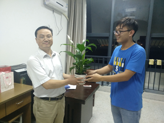 晚上八点,15自动化专业的党员同志带着同学们的心意来到自动化系老师方老师的办公室。新的学期刚刚开始,事务繁多,方老师依旧在校工作。看到学生的到来,老师和蔼可亲的脸上露出了熟悉的笑容。由于bet36365路检测中心本学期新搬入花津校区,同学们为老师带来一株茂盛的绿植,希望能够为这新的办公环境增添一抹绿意。同时,我们送上了同学们亲自书写的贺卡,上面承载着大家满满的祝福。同学们你一言,我一语,谈生活,谈学习,谈专业项目,谈职业规划,良师益友,交谈甚欢。